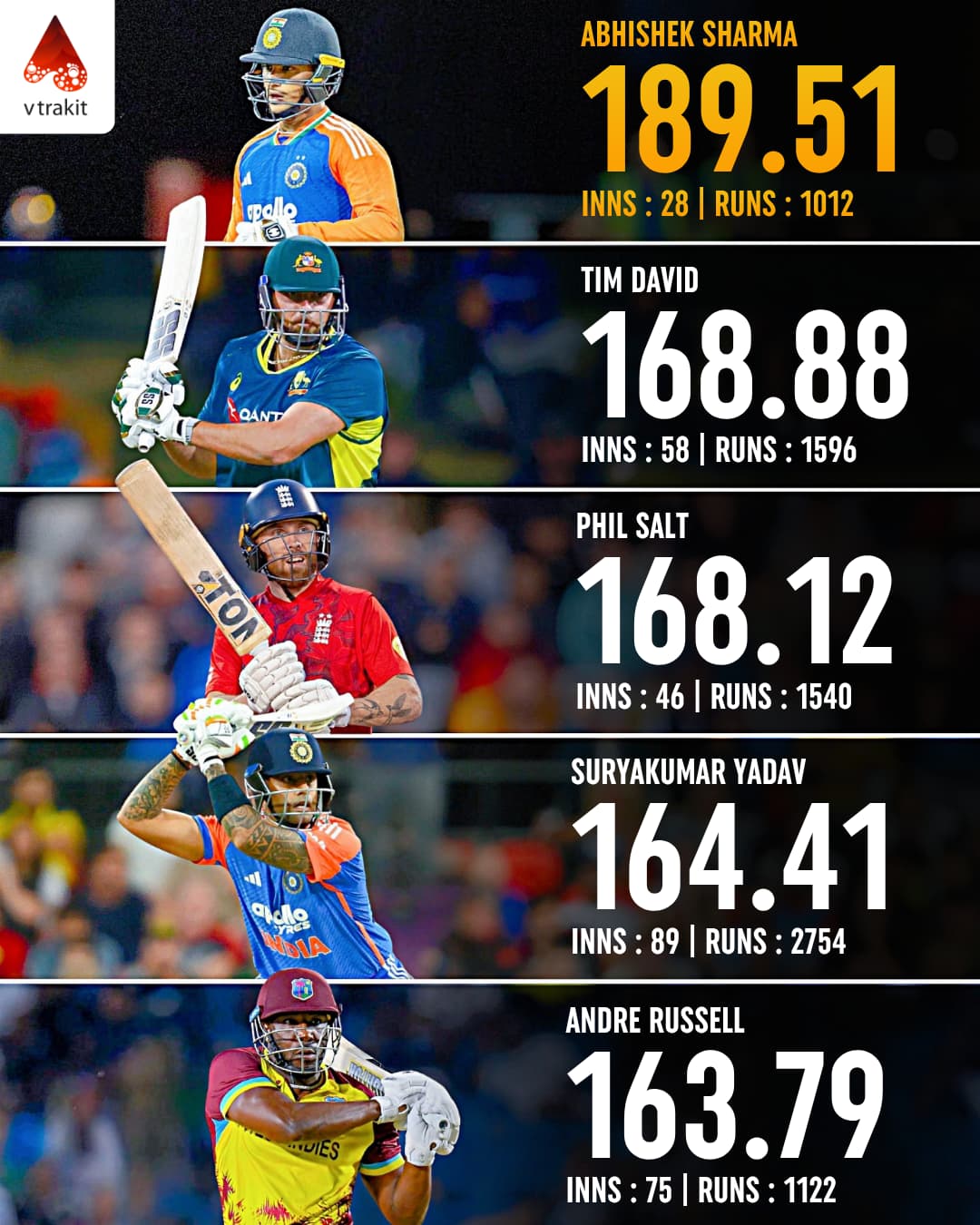 1. Best batting SR in T20Is (min 1000 runs)