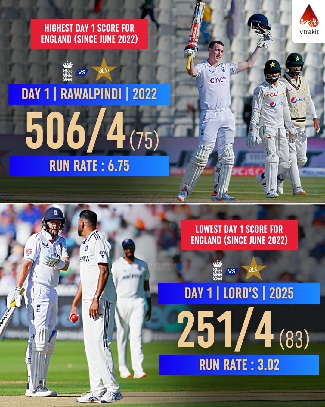 Highest and Lowest day 1 score for England in Bazball era Highest score - 506/4 (75) vs Pakistan in Rawalpindi, 2022 Lowest score - 251/4 vs India, Lord’s, 2025
