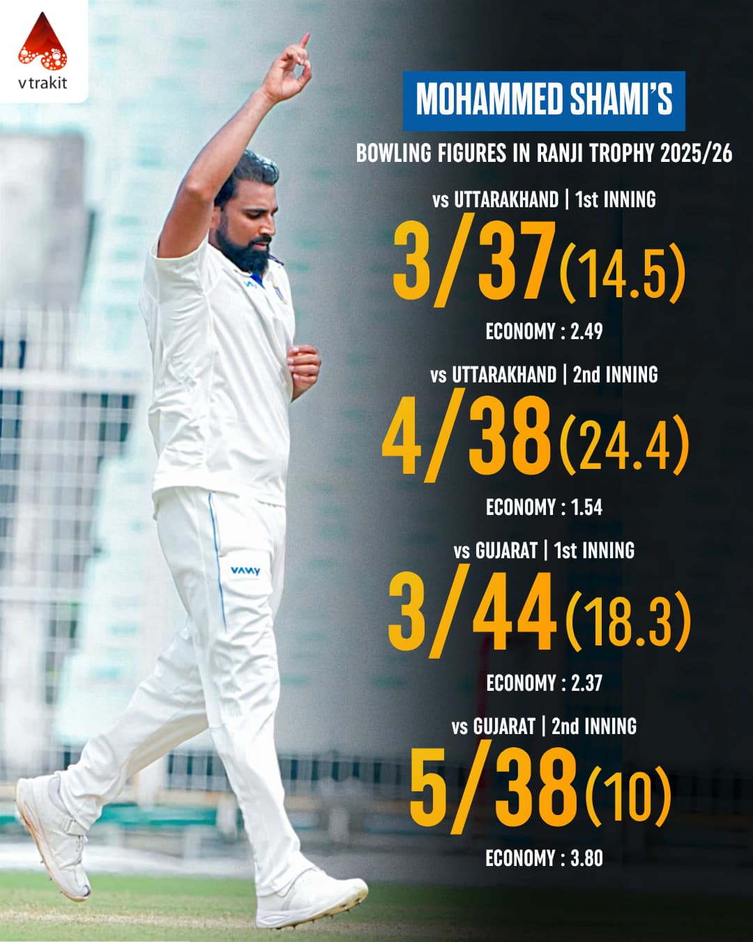 Mohammad Shami’s figures in Ranji Trophy 2025/26 INNINGS : 4 | RUNS : 408 | WICKETS : 15 | ECO : 2.30