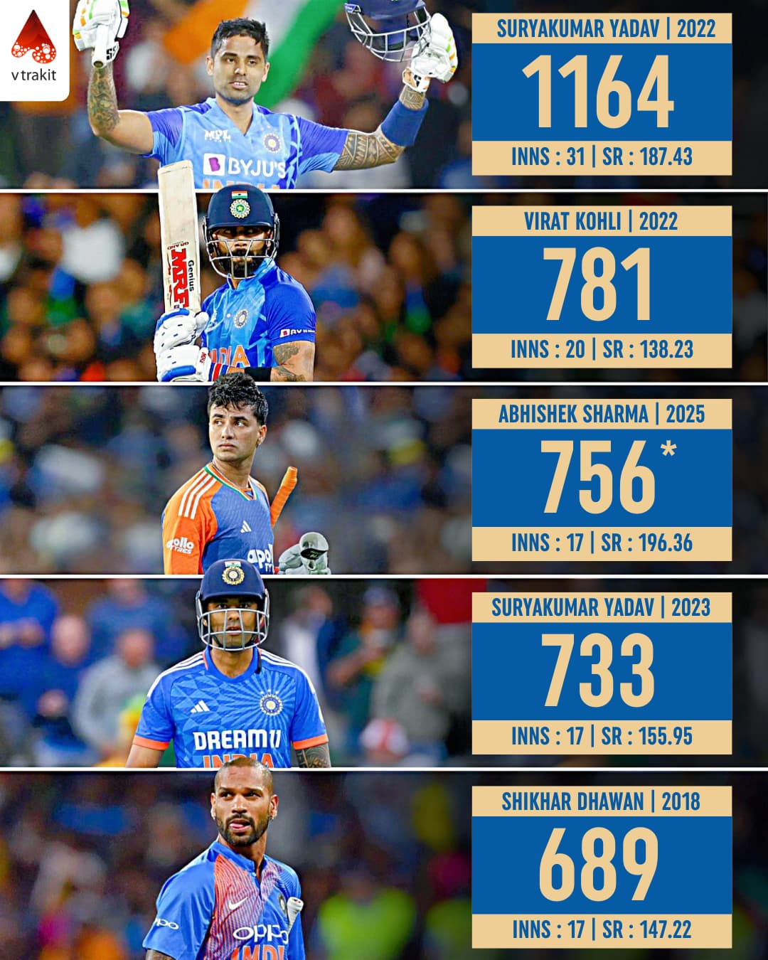 3. Most runs in a calendar year for India in T20Is