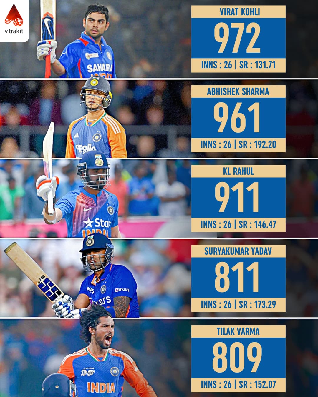 6. Most runs in first 26 innings in T20Is for India