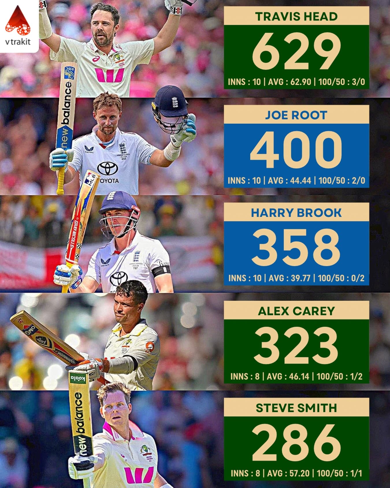 Most runs in The Ashes 2025/26 (as of 08.01.2026)