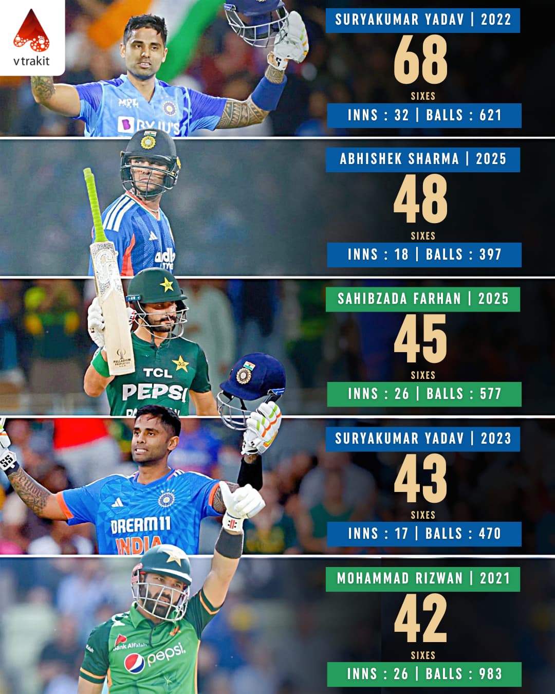 7. Most sixes in a calendar year in T20Is (among full member nations)