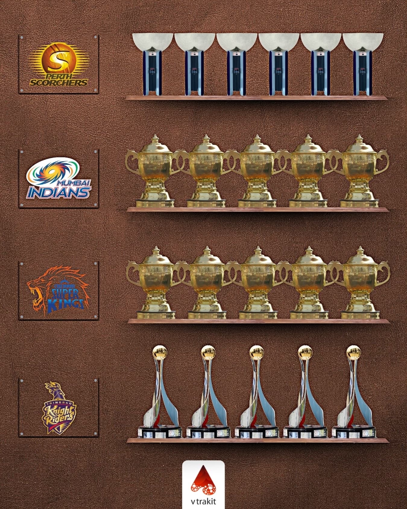 6 - Perth Scorchers (BBL) 5 - Mumbai Indians (IPL) 5 - Chennai Super Kings (IPL) 5 - Trinbago Knight Riders (CPL)