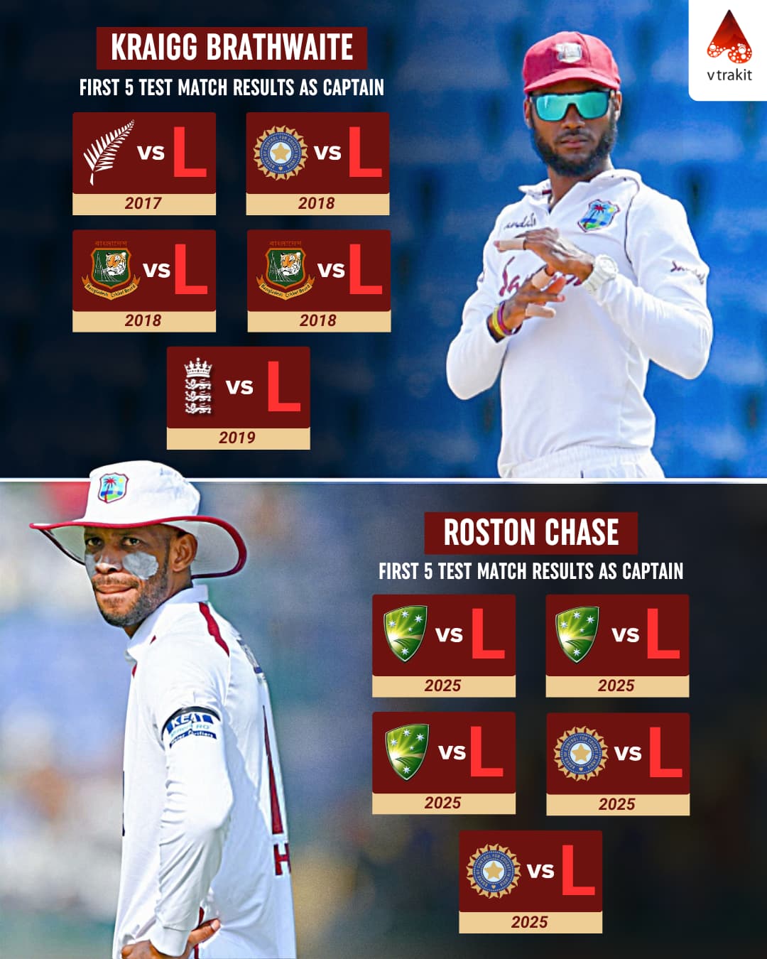 Roston Chase is now the second West Indies captain to lose his first five Tests in charge, after Kraigg Brathwaite.