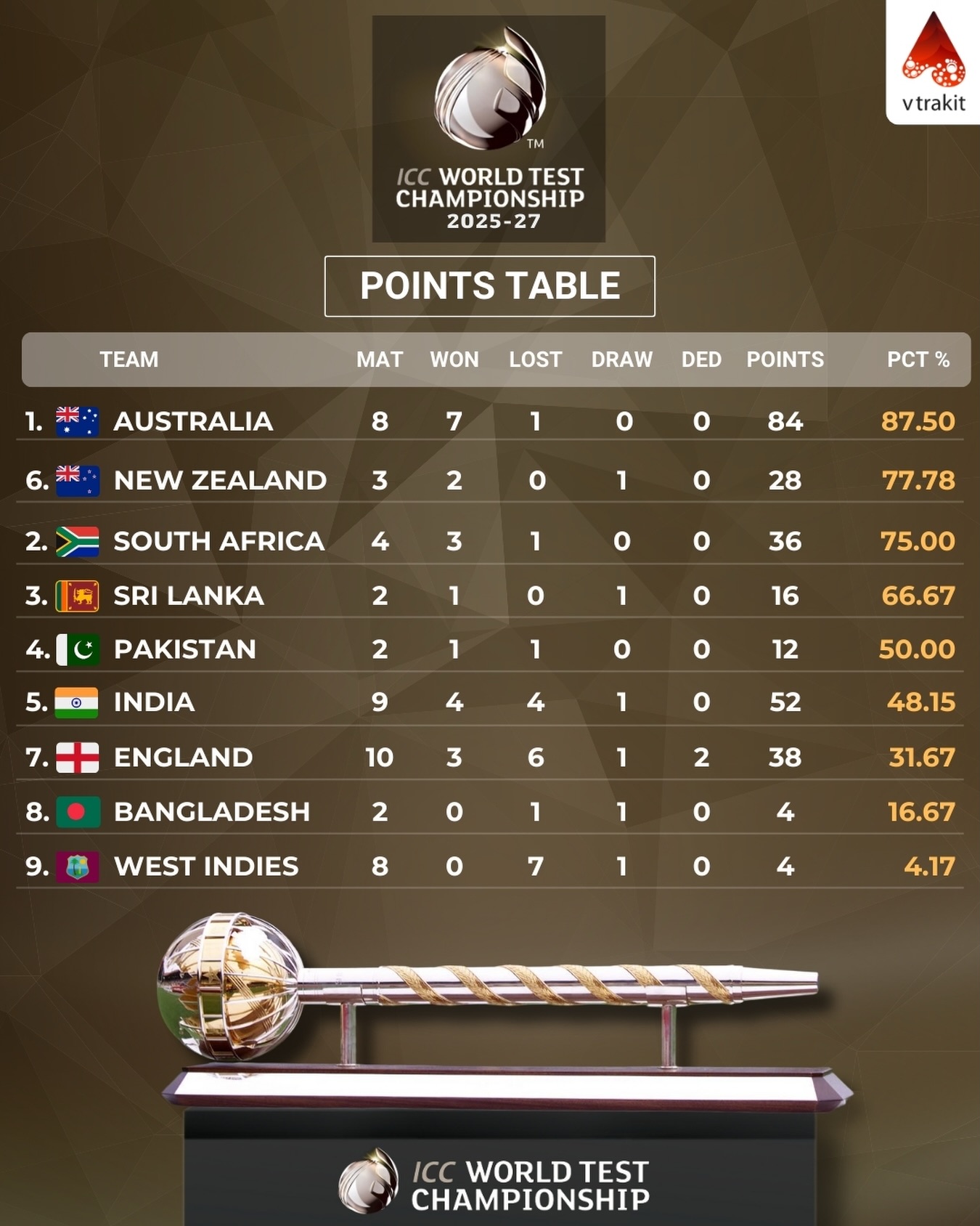 WTC 2025-27 Points Table (after the Ashes series)